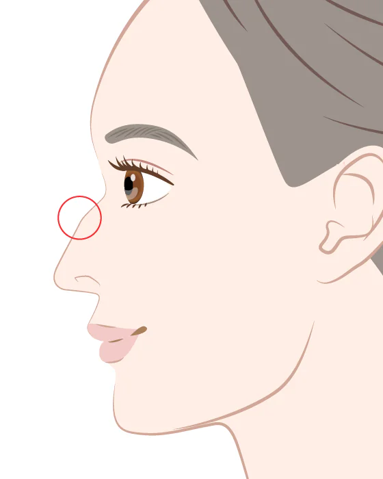 鼻筋の中央あたりが前方に大きく出ている、いわゆる“鷲のくちばし”のように湾曲した形状の鼻を指します。横から見ると、鼻骨部分が盛り上がっているため、鼻先に向かってアーチを描くようなシルエットになるのが特徴です。日本では「わし鼻」「魔女鼻」と呼ばれ、海外では「アクイラインノーズ(aquiline nose)」という英語名が使われることもあります。鼻筋が高い反面、正面や横からの印象が強くなりやすいため、わし鼻を緩やかにしたい・整えたいという方には、施術による段差の修正や骨の削りなどの施術がおすすめです。