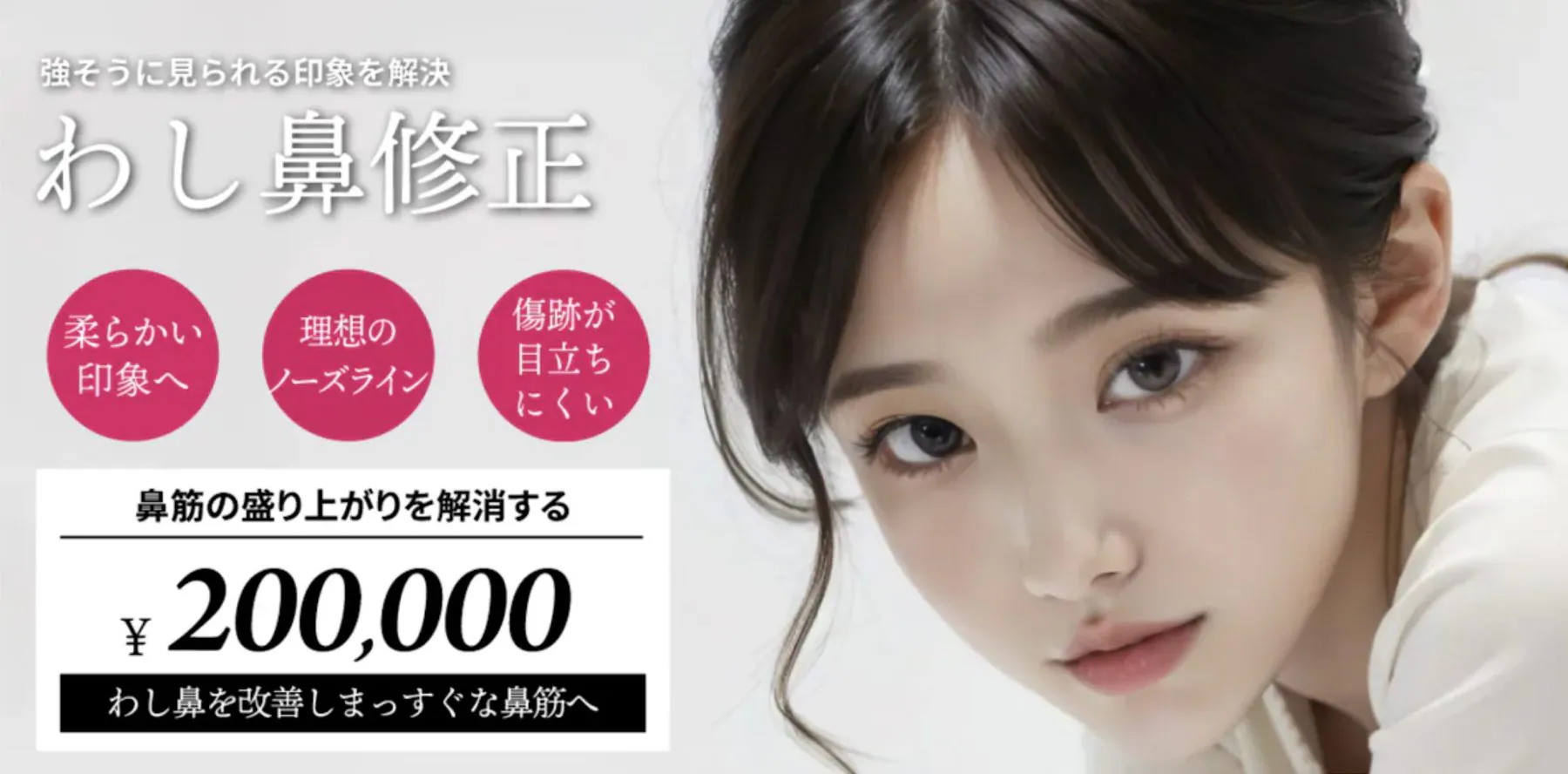 まずは、顔の骨格から最適なラインを診断し、前からも横からもどこから見ても美しい鼻をデザインします。デザインしたラインに沿って切除する鼻骨を決め、出っ張ってワシ鼻に見える鼻骨を切り取り、真っ直ぐなラインに修正します。鷲鼻を修正する事で、優しそうなイメージになることができます。骨を削ることに抵抗がある方は、凹んでいる箇所に『ヒアルロン酸』や『プロテーゼ』を入れて、カバーすることができます。