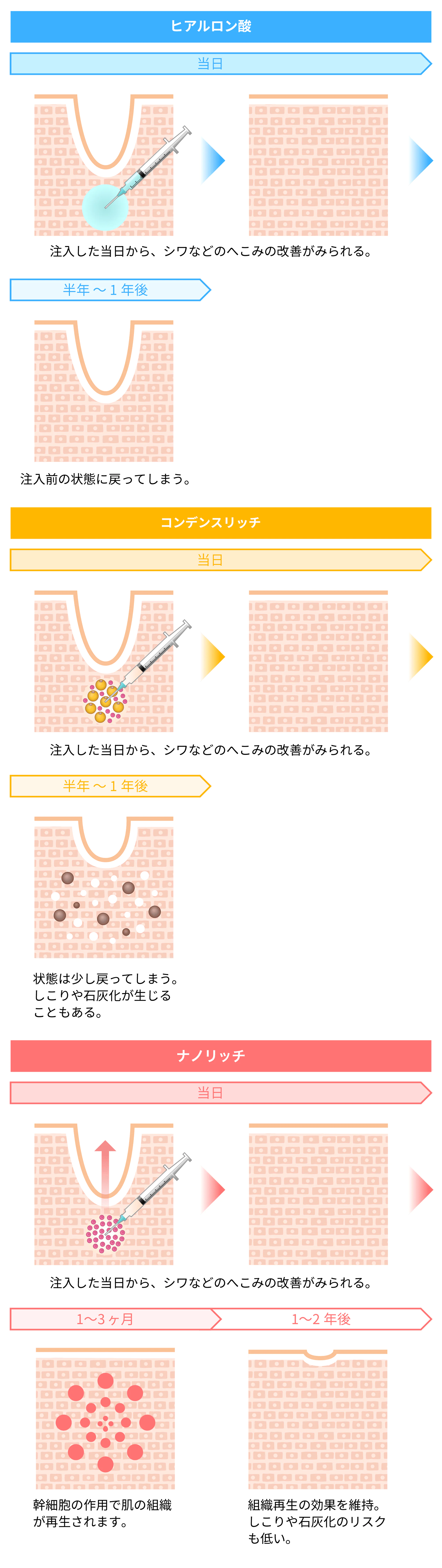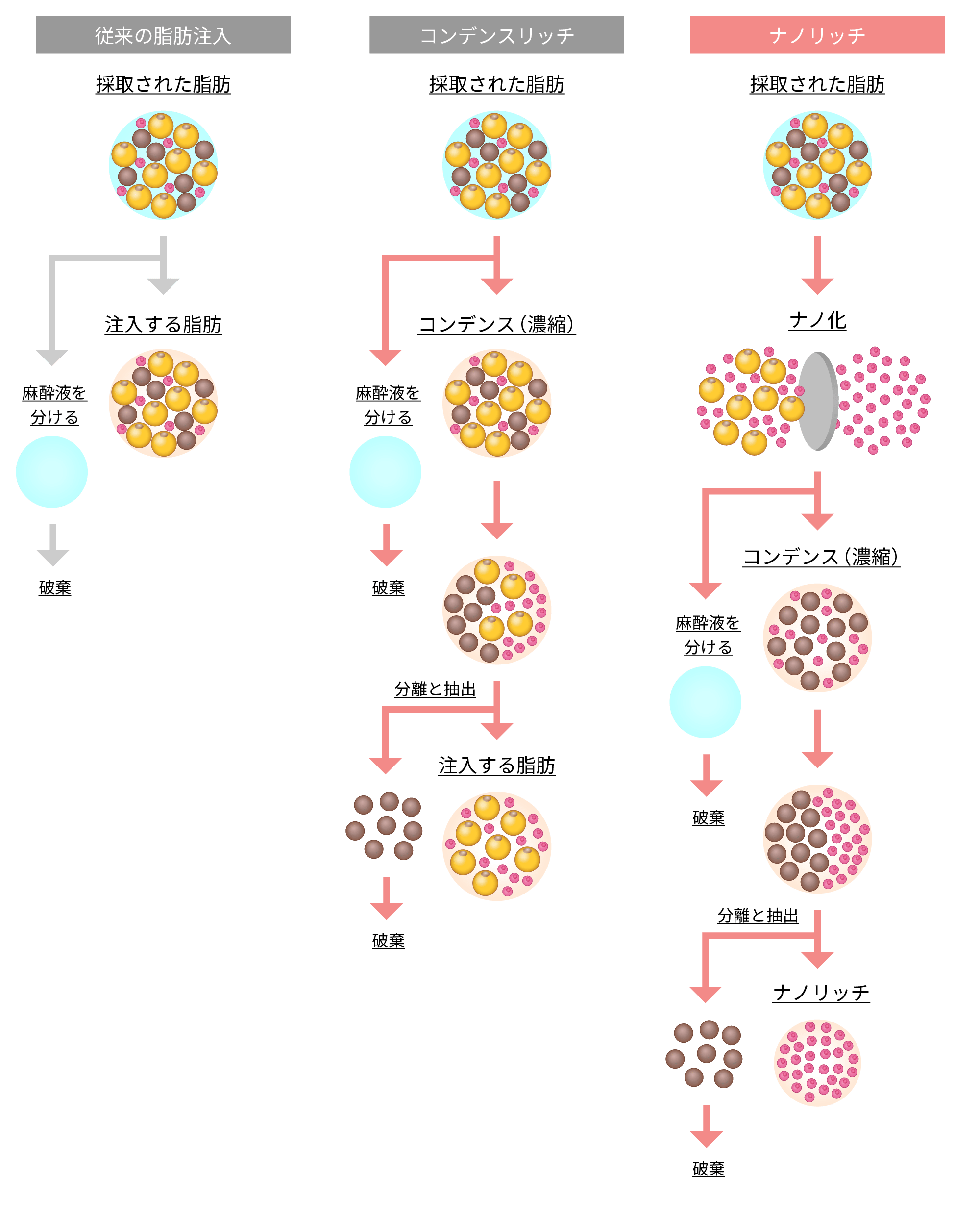 | 治療内容 | ヒアルロン酸を注入 | 吸引した自分の脂肪をコンデンス(濃縮)技術により濃縮脂肪細胞とし注入する | 吸引した脂肪をマイクロ、ナノサイズ化する過程で繊維質を除去し、生存脂肪を破砕して幹細胞を抽出。さらにコンデンス(濃縮)加工して得られたナノリッチを注入する。 |