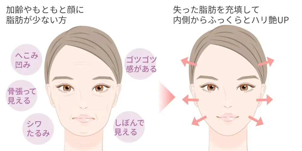 もともと脂肪が少なく骨張って見える方や、加齢に伴うお顔の脂肪の減少で、頬がこけて見えたり、目元がくぼんだり、シワが気になる方におすすめです。