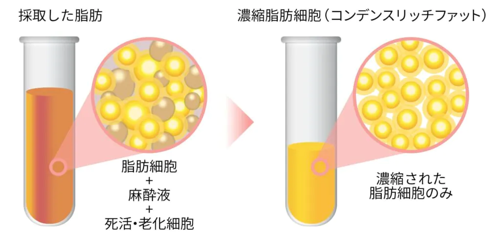 独自のコンデンス(濃縮)技術で死活・老化細胞を取り除いた濃縮脂肪を、無菌状態で注入。しこりや脂肪壊死が起こりにくくなりました。