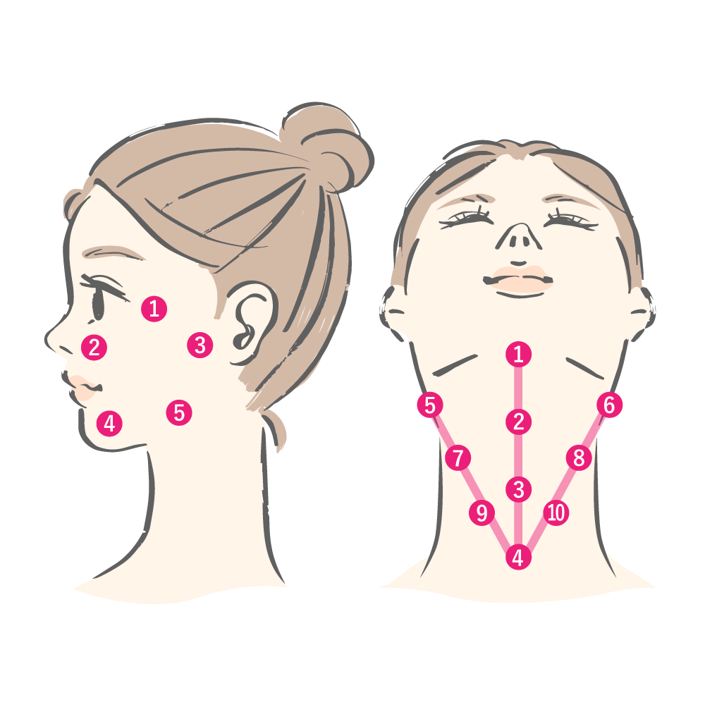 | 注入場所 | 顔や首は、各10カ所の注入で 全体に自然に広がる(BAP注入法) |