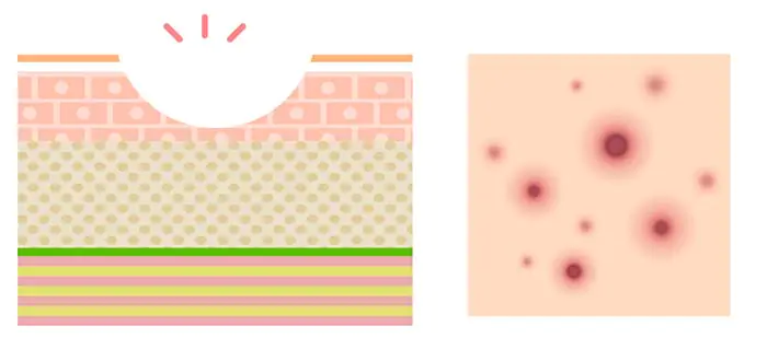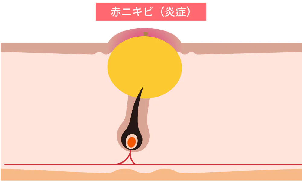 - 毛穴に溜まった皮脂を栄養分としてアクネ菌が繁殖して炎症が起きる。赤く腫れている状態。触れると痛い場合も。