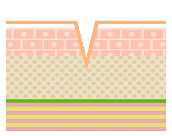 クレーターの直径は4~5ミリ以上の大きくいびつな楕円のような形のものが多い。深さは深めのものが多い。(真皮層・皮下組織)