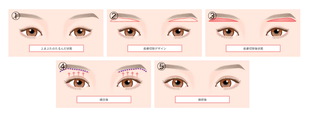 目の上の余分な皮膚のたるみと脂肪を眉毛の下のラインに沿って切除することで、目の上のしわ、たるみの症状をしっかり改善させる手術方法です。