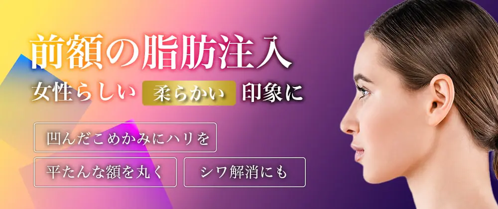 おでこへの注入は毛髪や眉毛の生えているところから、カニューレという細い管を挿入して行いますので、顔には傷跡はほぼ残りません。注入した脂肪の生着率は通常50-70%程度ですが、実際のところは予測が困難です。当院では生着率を向上させるために、不純物をできるだけ取り除いた脂肪(コンデンスリッチファット・ナノファット)のオプションも用意しています。