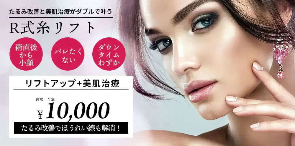 R式糸リフトとは、完全な生体適合性をもつ医療用の糸を、お顔の皮膚下に挿入して皮膚や筋肉を引き上げて、たるみやシワを改善させるリフトアップ(スレッドリフト=糸リフト)施術です。使用する糸は、小さい棘状の突起(コグ)がついており、細いながらも耐久性と伸縮性を兼ね備えた特殊構造の糸です。そのため、Rクリニックの糸リフト施術では、従来の糸では治療が難しい、目元周辺・フェイスラインを引き上げることが可能です。