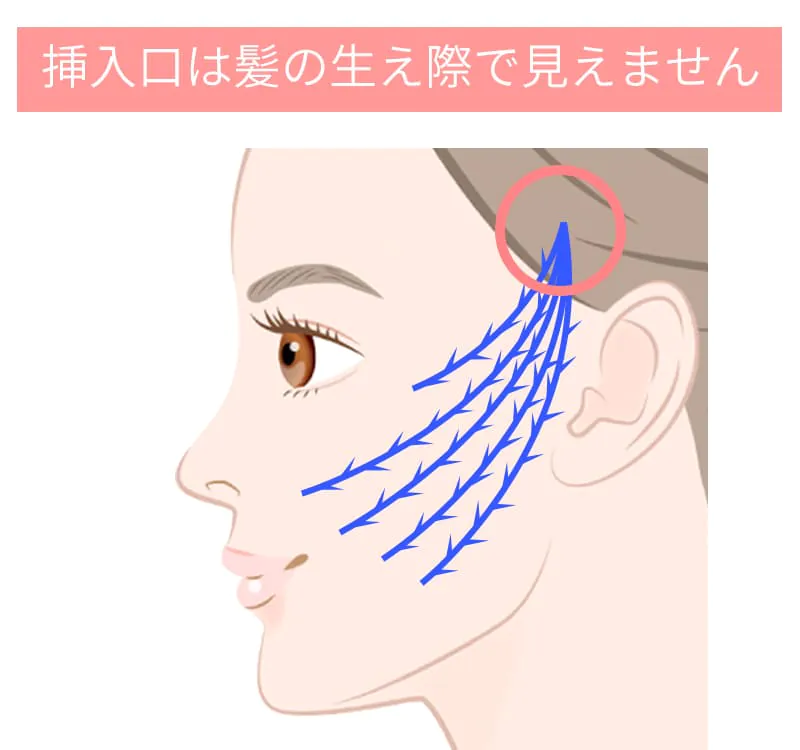 引き上げる糸の挿入口は、顔の側面(主に髪の生え際付近)から左右一か所ずつの針穴だけですので、目立つことはありません。