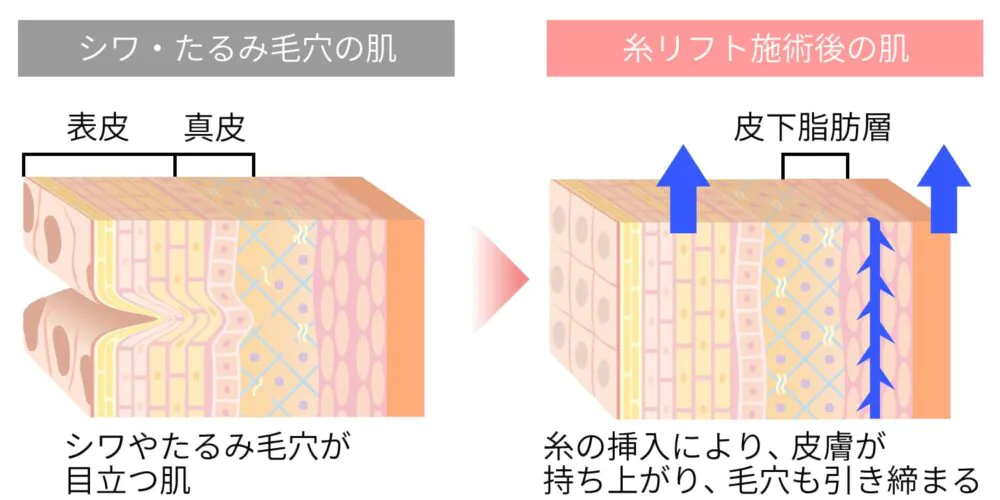 糸を挿入して物理的に皮膚を引き上げるため、シワの原因となっていたたるみが解消されます。そのことで、ほうれい線などのシワやたるんで楕円状になっていたたるみ毛穴が改善され、引き締まります。