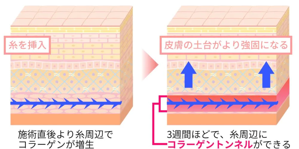 糸の挿入による効果は引き上げだけではありません。挿入した刺激により、真皮奥の皮下組織で線維芽細胞のはたらきが活発になり、コラーゲンを増生します。さらに3週間程度で糸周辺を覆うようにコラーゲン・エラスチンの産生がより活性化されるため、コラーゲントンネルが形成されます。これによって、リフトアップ効果を強固に持続させるとともに、肌のハリ艶をアップさせ、一層美肌に仕上げます。