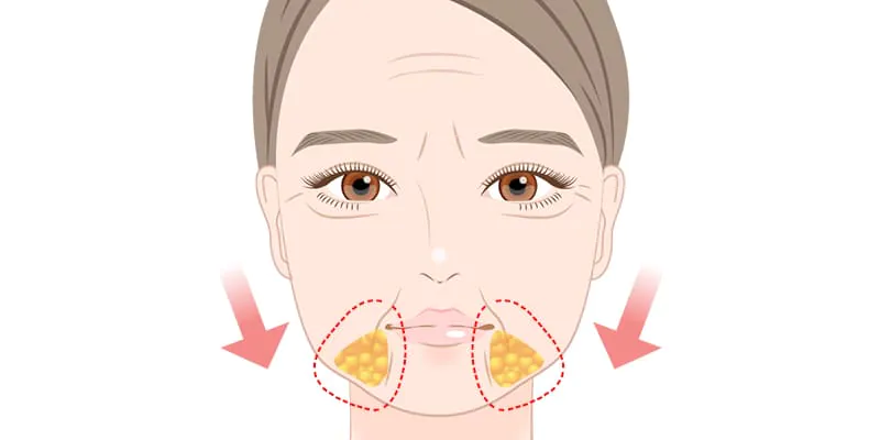 口角横から下周辺にかけて脂肪が多い、または下垂することにより、マリオネットラインやフェイスラインのゆるみなどが出現します。適宜脂肪を除去することにより、口角まわりをすっきりとした印象にします。遺伝的な要素もあり、必ずしも加齢によることが要因にはならない症状です。