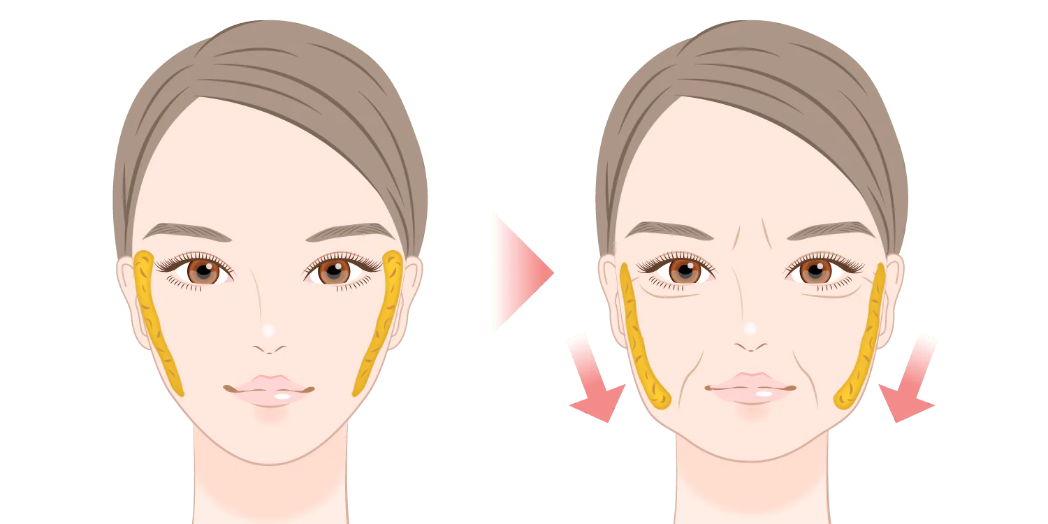 垂れ下がってしまうと、ほうれい線・たるみ・マリオネットラインが酷くなり、まるでブルドッグのような顔立ちになり、老けた印象を引き起こしてしまいます。